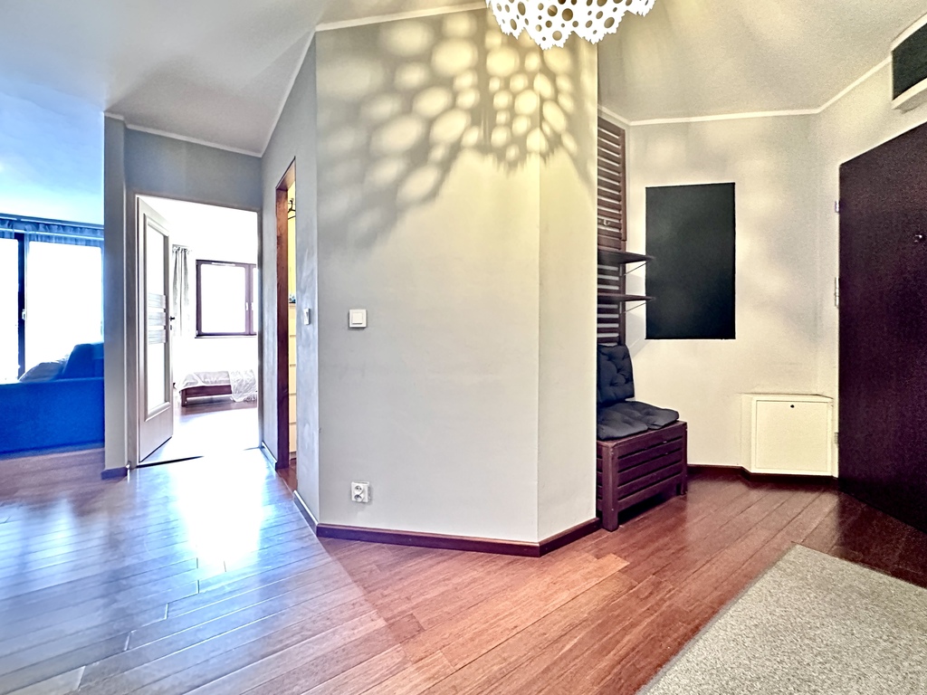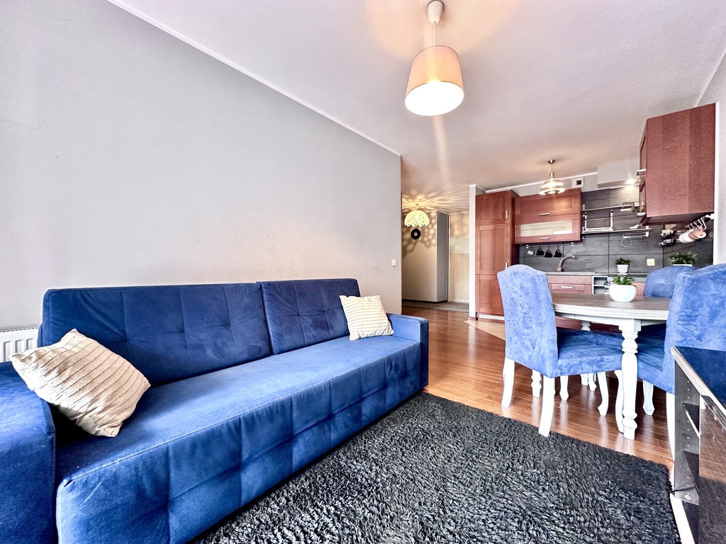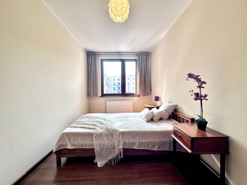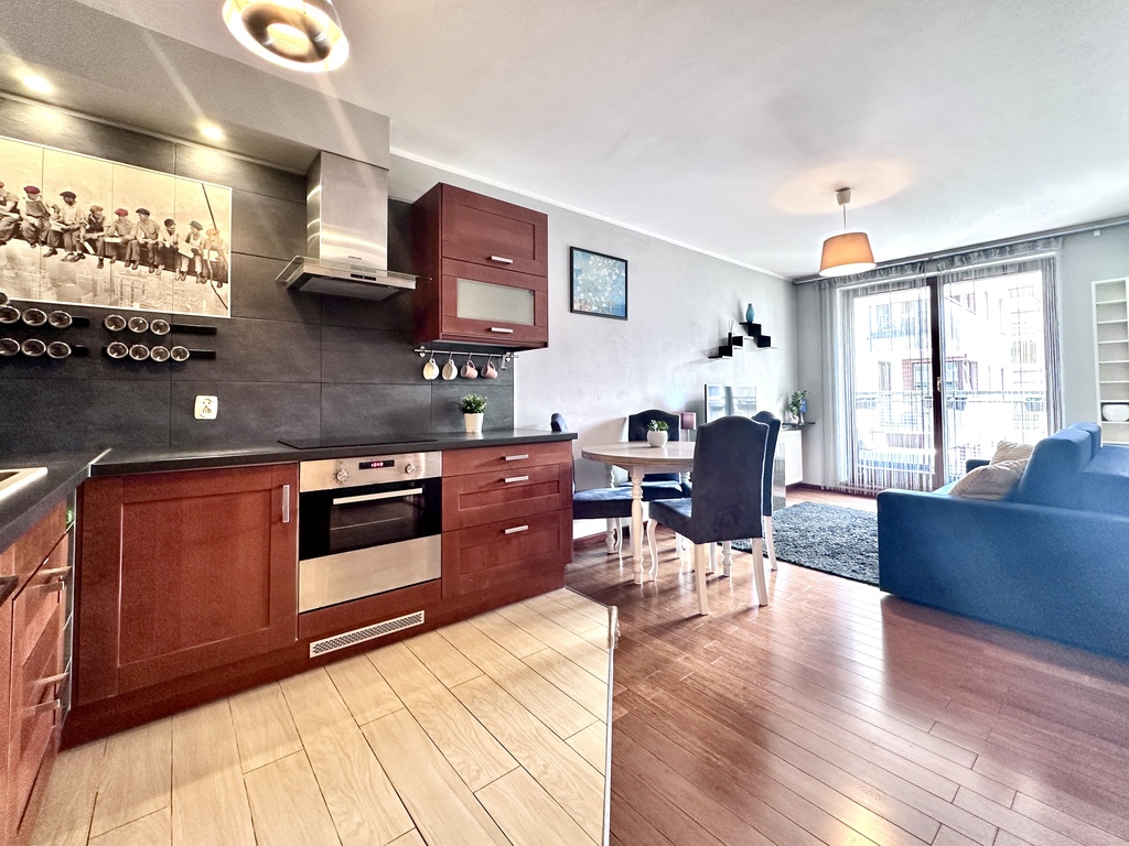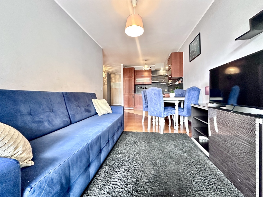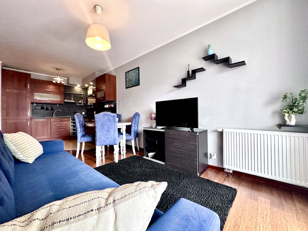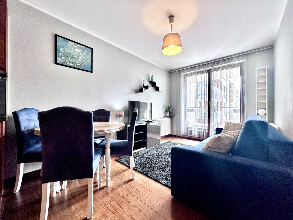 A stylish and spacious two-room apartment is available for rent immediately. The tastefully decorated living room features a corner sofa bed, a dining table with chairs, and a TV. The kitchen is fully equipped with high-quality appliances (fridge with freezer, oven, hood, electric hob, kettle, dishwasher) and basic kitchen appliances. The bedroom features a comfortable double bed, a chest of drawers, a mirror, and built-in shelving (not shown in the photos). The bathroom features a shower and offers ample storage space. The hallway features a spacious built-in wardrobe.
