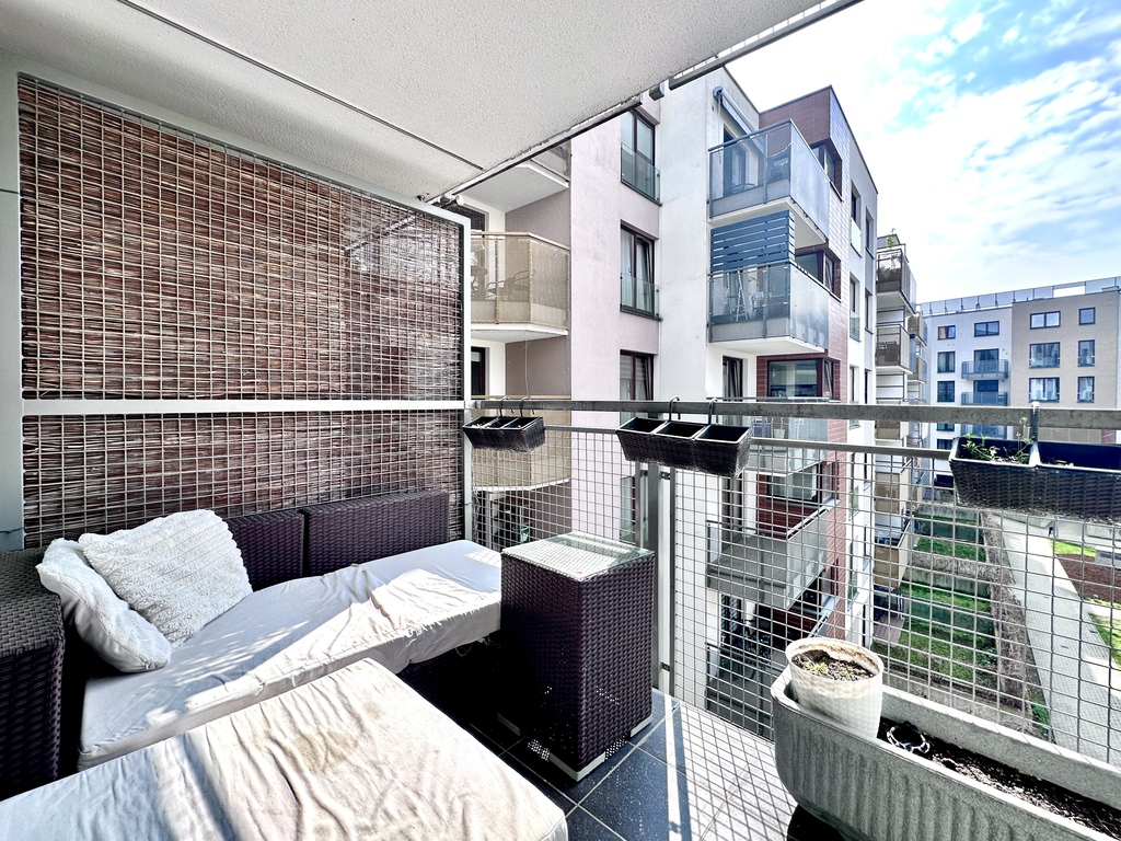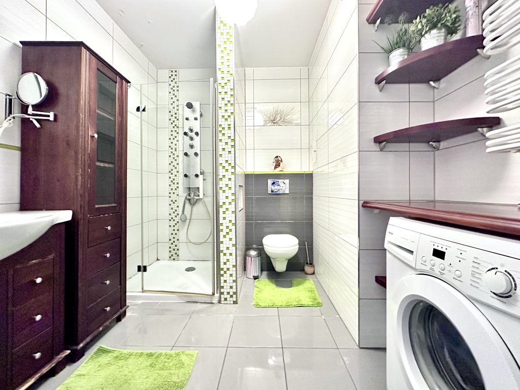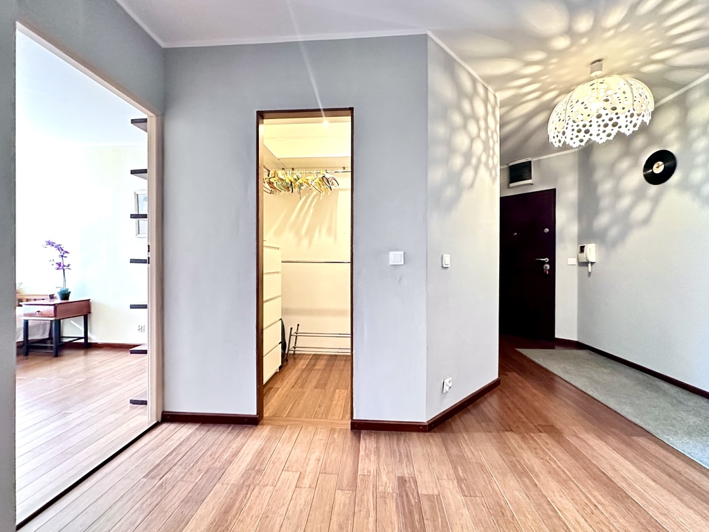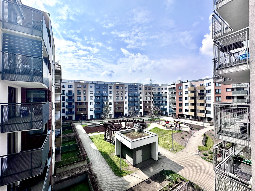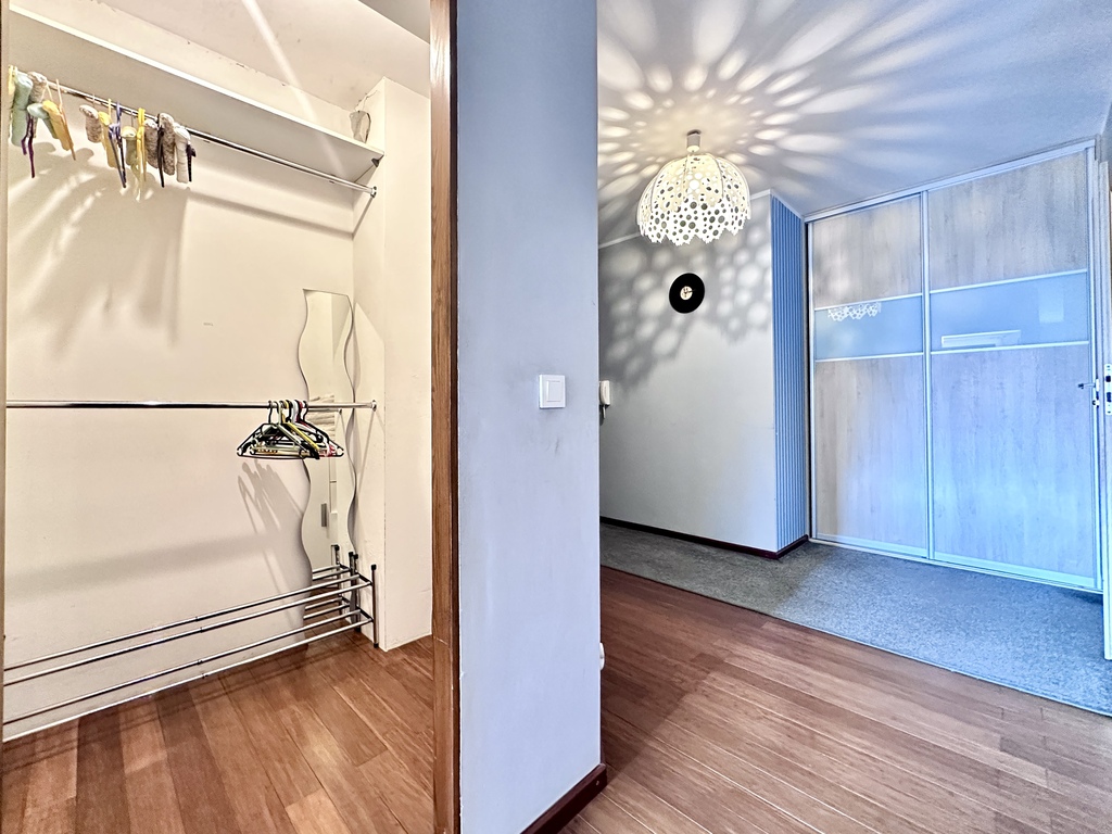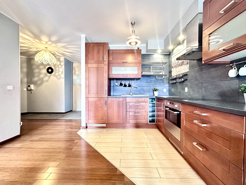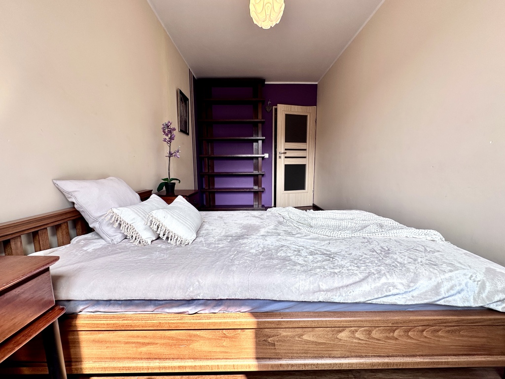 A stylish and spacious two-room apartment is available for rent immediately. The tastefully decorated living room features a corner sofa bed, a dining table with chairs, and a TV. The kitchen is fully equipped with high-quality appliances (fridge with freezer, oven, hood, electric hob, kettle, dishwasher) and basic kitchen appliances. The bedroom features a comfortable double bed, a chest of drawers, a mirror, and built-in shelving (not shown in the photos). The bathroom features a shower and offers ample storage space. The hallway features a spacious built-in wardrobe.